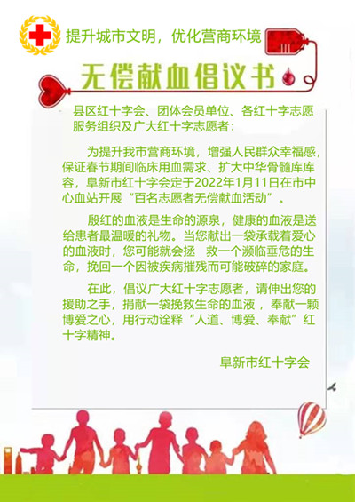 为提升我市营商环境,增强人民群众幸福感,保证春节期间临床用血需求、扩大中华骨髓库库容,阜新市红十字会定于2022年1月11日在市中心血站开展“百名志愿者无偿献血活动”。